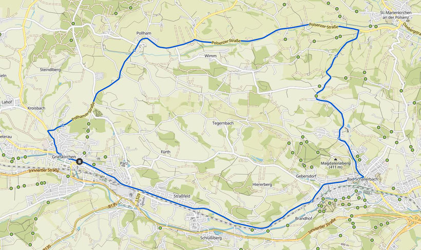 Der Rundkurs beginnt am Stadtplatz Grieskirchen unweit der Stadtkirche. Kurz vor dem Mittagssignal des selig g'sproch' Glockengeläut - also genauer gesagt um 11:55 - starten wir bei tosendem Applaus einer zu hunderten angereister radbegeisterten Zuschauerschar am oberen Stadtplatz Richtung Osten, halten uns nordwärts beim Klinikum vorbei und schließlich scharf rechts abbiegend auf die Pollhamer Straße, welche die erste leichte Steigung zum höchsten Punkt (450m) der Strecke darstellt. Kurz darauf erreichen wir Pollham und halten uns wiederum rechts auf der nun stetig abwärts führenden Polsenzer Straße in Richtung St. Marienkirchen (Sankt Marein - wie die Innviertler zu sagen pflegen). Kurz vor Ortsbeginn von St. Marein beginnt nun der wahrscheinlich stärkste Teil der Strecke. Rechts abbiegend geht es aufwärts über Fürneredt nach Buch (Labstelle), welche mit 430m den zweithöchsten Punkt der Strecke darstellt. Steil abwärts sausen wir durch Schönau nach Bad Schallerbach, biegen am Rathausplatz rechts ab und ziehen nunmehr der alten Bundesstrasse (Grieskirchner Straße) entlang wieder zum Ausgangsort Grieskirchen.